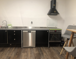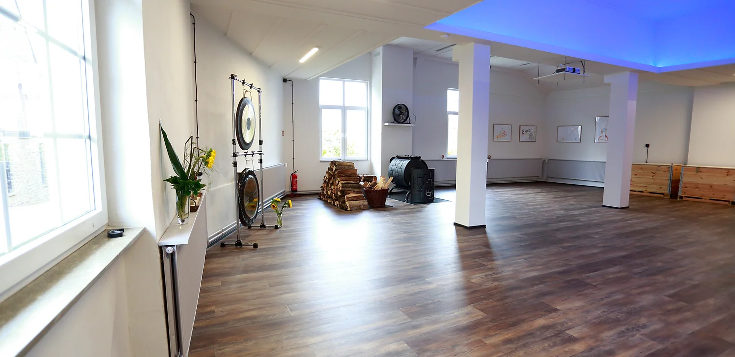 Die Ausstattung umfasst zudem ausreichend Tische und Stühle, eine vollständig eingerichtete Küche und Beleuchtungsoptionen, die in warmweißem Licht erstrahlen und über Dimmer sowie Farboptionen verfügen. Die hohen Fenster lassen viel natürliches Tageslicht herein. Zudem ist der Raum corona-konform für größere Personengruppen ausgerichtet.